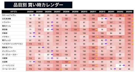 カレンダーの推移を辿ると、上位のカテゴリは昨年4月の底値圏から上昇を続けてきましたが、3月に入り価格が落ち着きを見せています。一方で、「コーヒーメーカー(80)」や「ノートパソコン(91.7)」、「洗濯機(94)」はスコアが低く、現在は割高な傾向にあります。