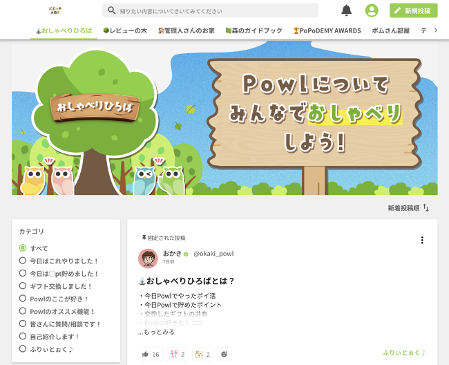 しかし、それぞれのユーザーが持っているノウハウをユーザー同士がお互いに共有し合うことで、一人では見つけることのできなかった効率的なポイントの貯め方を知ることができたり、より自分に合った案件に巡り合うことができたりする可能性が高まります。そのようなことが可能なコミュニティという場が存在することで、ユーザー一人一人のポイ活ライフが豊かになるのではないかと考え、この度「Powl(ポール)」のコミュニティ「ポポッ子の森」を開設しました。