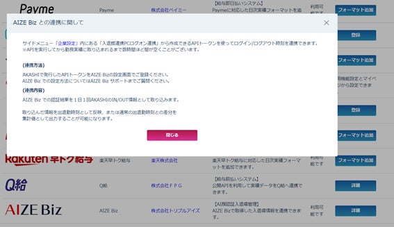 今回のAPI連携によって、「AIZE Biz」にて顔認証を行った日時情報を「AKASHI」の出退勤情報として自動登録、または通常の出退勤時刻との差分を集計値として出力することが可能になります。この連携により、「AIZE Biz」をご利用中の企業は「AKASHI」側での出退勤打刻が不要となり、従業員の打刻漏れ防止・サービス残業の抑制に寄与し、勤怠管理関連業務の時間短縮につなげることができます。