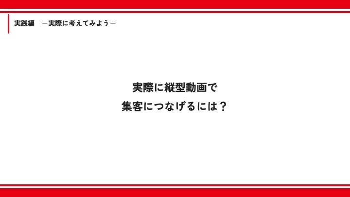 まずは縦型メディアの特性や最新トレンド、横動画との構成意図の違いなど、「動画がどのように見られているか?」を理解するための土台づくりを行いました。