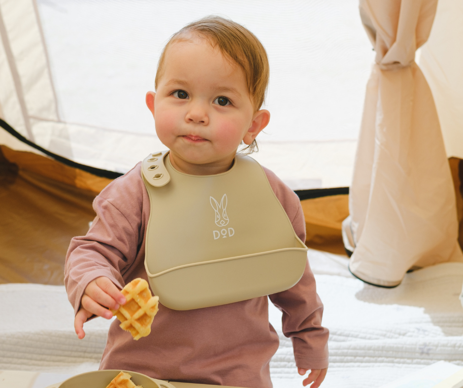 シリコーンゴム製でコンパクトにたためるビブは、ポケットにカトラリーも収納可能な優れもの。