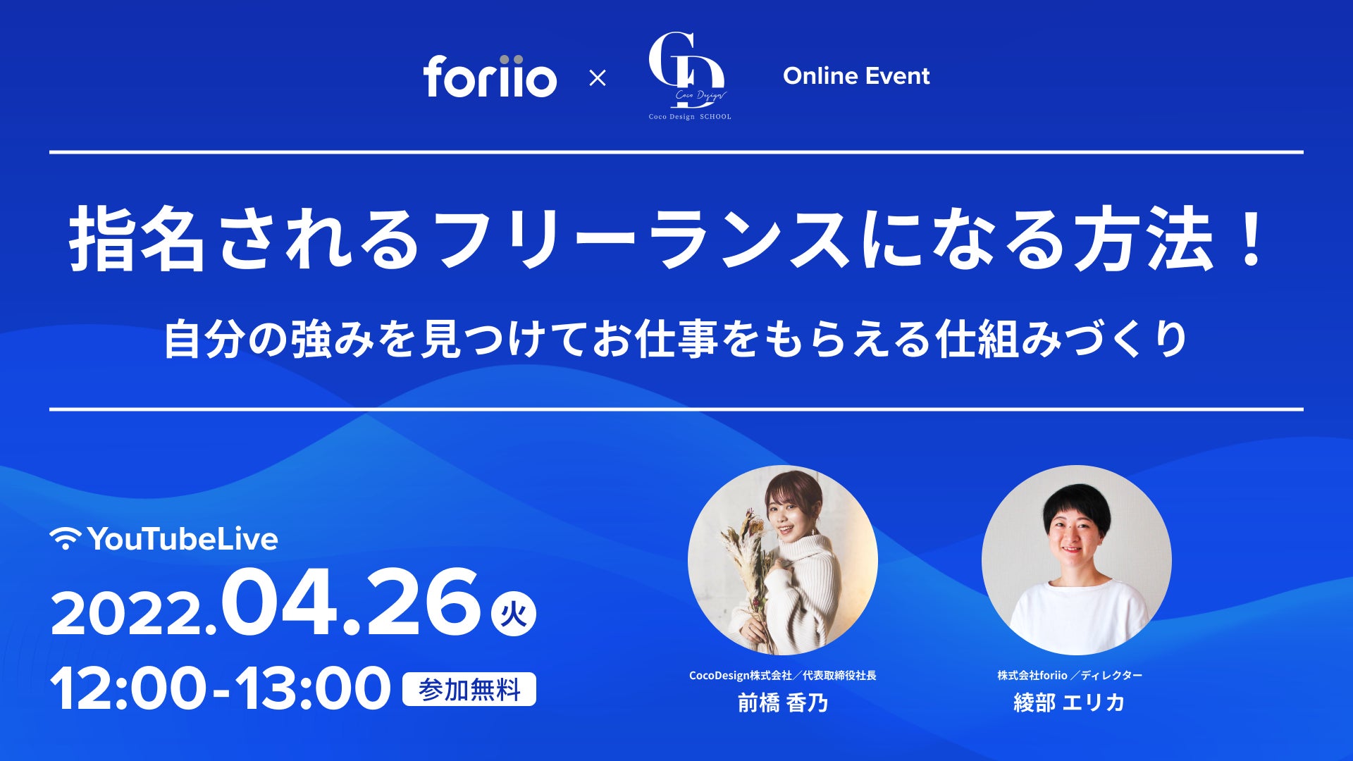 4/26(火)12:00開催!「指名されるフリーランスになる方法!」というテーマに沿った、foriio × CocoDesignの無料のオンライン共催イベントです。
