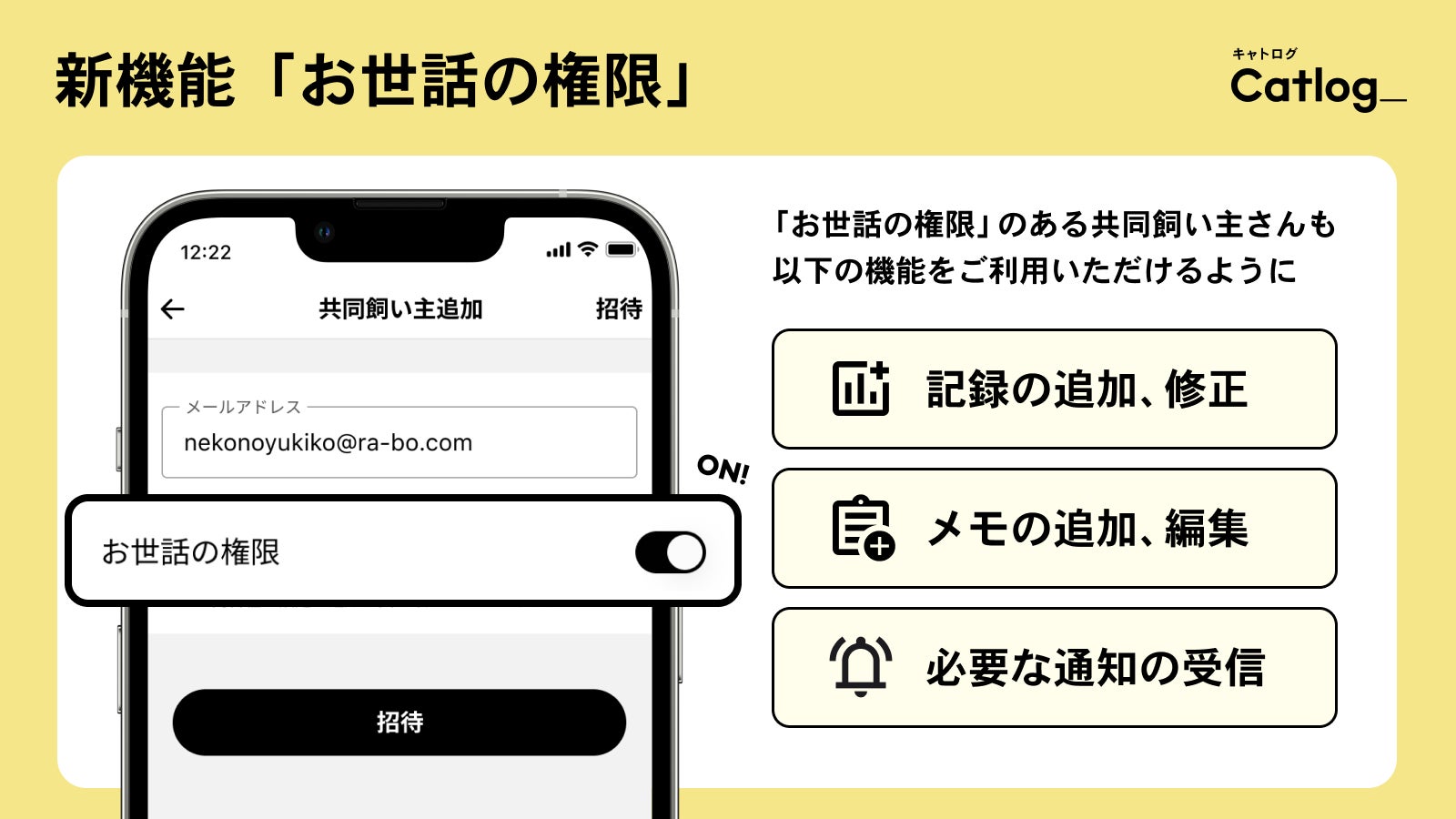 「(共同飼い主の方が)実際のお世話は自分がメインでやっているからCatlogも同様に利用したい!」や「実家の猫様にCatlogを使ってあげたい&何か変化があったらアラートなど自分も受け取りたい!」などご利用のお客様たちの声により生まれたアップデートです。同居されているご家族はもちろん、ご実家の猫様、ご友人の猫様など、離れていてもCatlogを通じて猫様を近くに感じていただけるため、この春から新生活を始められるみにゃさまや、様々な環境変化等により愛する猫様と離れてしまうみにゃさまにも、引き続き近い距離で猫様を見守っていただけます。