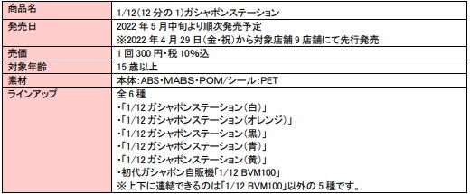 バンダイ「ガシャポン」45 周年や“昭和レトロ”を感じていただける本商品の発売を記念し、5 月中旬からの全国 発売に先がけて、「ガシャポンのデパート 池袋総本店」と、ガシャポンバンダイオフィシャルショップ 8 店舗(東京ソ ラマチ店、新宿マルイアネックス店、横浜ビブレ店、金沢フォーラス店、OS シネマズ神戸ハーバーランド店、キャナ ルシティ博多店、福岡パルコ店、サクラマチクマモト店)にて、「昭和の日」である 4 月 29 日(金・祝)から先行発売します。