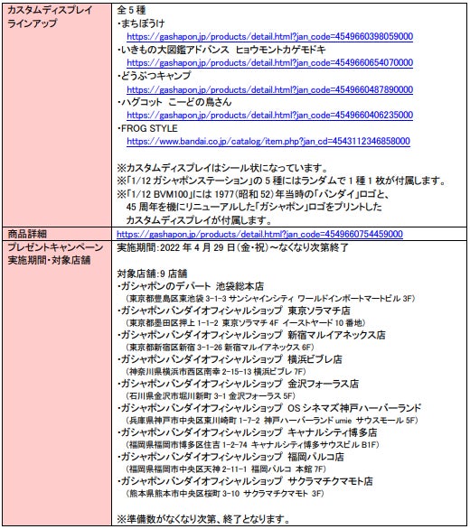 このたび、バンダイ「ガシャポン」45 周年や“昭和レトロ”を感じていただける本商品の発売を記念し、「昭和の日」であ る 4 月 29 日(金・祝)から、「ガシャポンのデパート 池袋総本店」など全国 9 店舗にて『1/12 ガシャポンステーション』を 先行発売します。また、4 月 29 日(金・祝)からの期間限定で、先行発売 9 店舗にて、プレゼントキャンペーンも併せて実 施します。『1/12 ガシャポンステーション』を 3 個ご購入いただいた方に、1977(昭和 52)年から 2022 年現在までのガシ ャポン自販機の進化を約 5cm の小さな本にまとめた「ガシャポン自販機 45 周年の歩み豆本」(非売品、数量限定)をプ レゼントします。