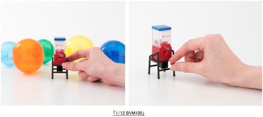 加えて、バンダイが 1977(昭和 52)年、カプセルトイ市場に参入した当時の初代ガシャポン自販機「BVM100」も ラインアップしています。「1/12 BVM100」には、1977(昭和 52)年当時の「バンダイ」ロゴと、45 周年を機にリニュー アルした「ガシャポン」ロゴをプリントしたカスタムディスプレイが付属します。