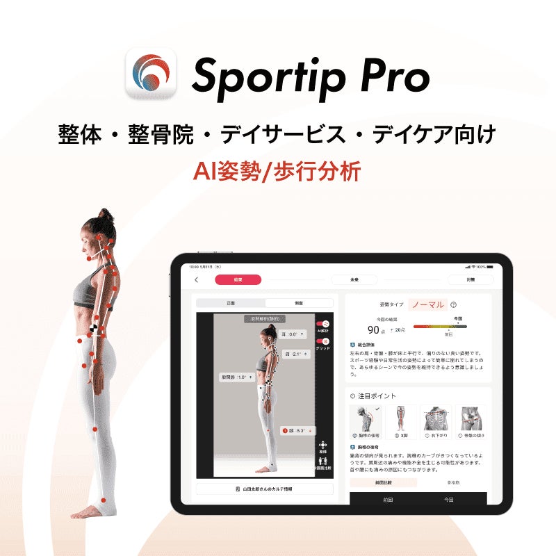 今回の研究で使用される『Sportip Pro』は、ジム・整体/接骨院・デイサービス等のアセスメントをAIで効率化・高度化することで売上アップ・コストカットを支援するAIアプリです。スマートフォン・タブレットで撮影するだけで個人の身体情報を可視化し、適切な運動メニューをわずか ”1秒” のうちに提供可能です。4種の姿勢分析機能やROMテスト機能・歩行分析機能・ジャンプ計測機能など200を超える測定機能から、2000を超える運動メニューがクライアント様・会員様へぴったりな形で自動提案されます。