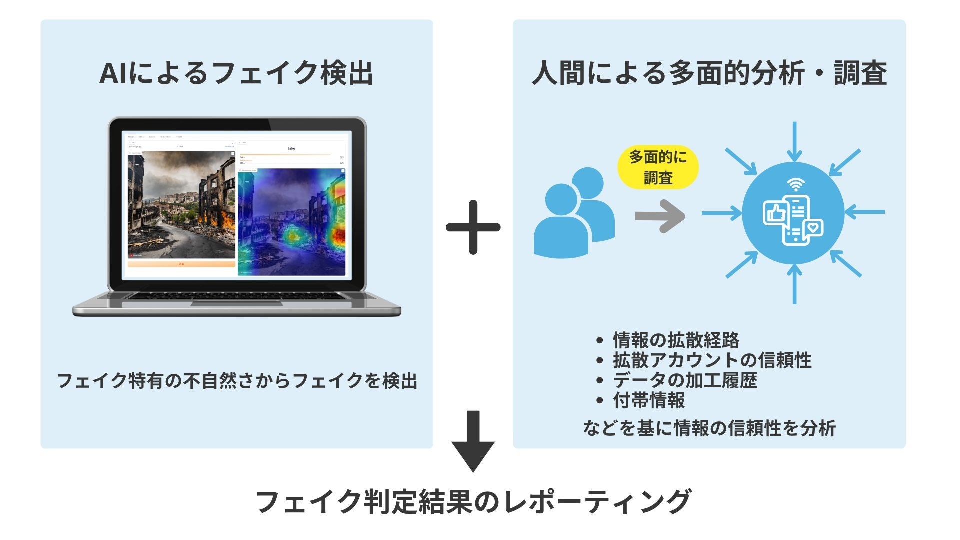 そこで当社では、これまでフェイク検出技術の開発に取り組んできた知見を基に、AIによるフェイク判定に加え、人間があらゆる視点からデータを解析し多面的に情報の信頼性を検証する「フェイク判定レポート」を開始することにいたしました。