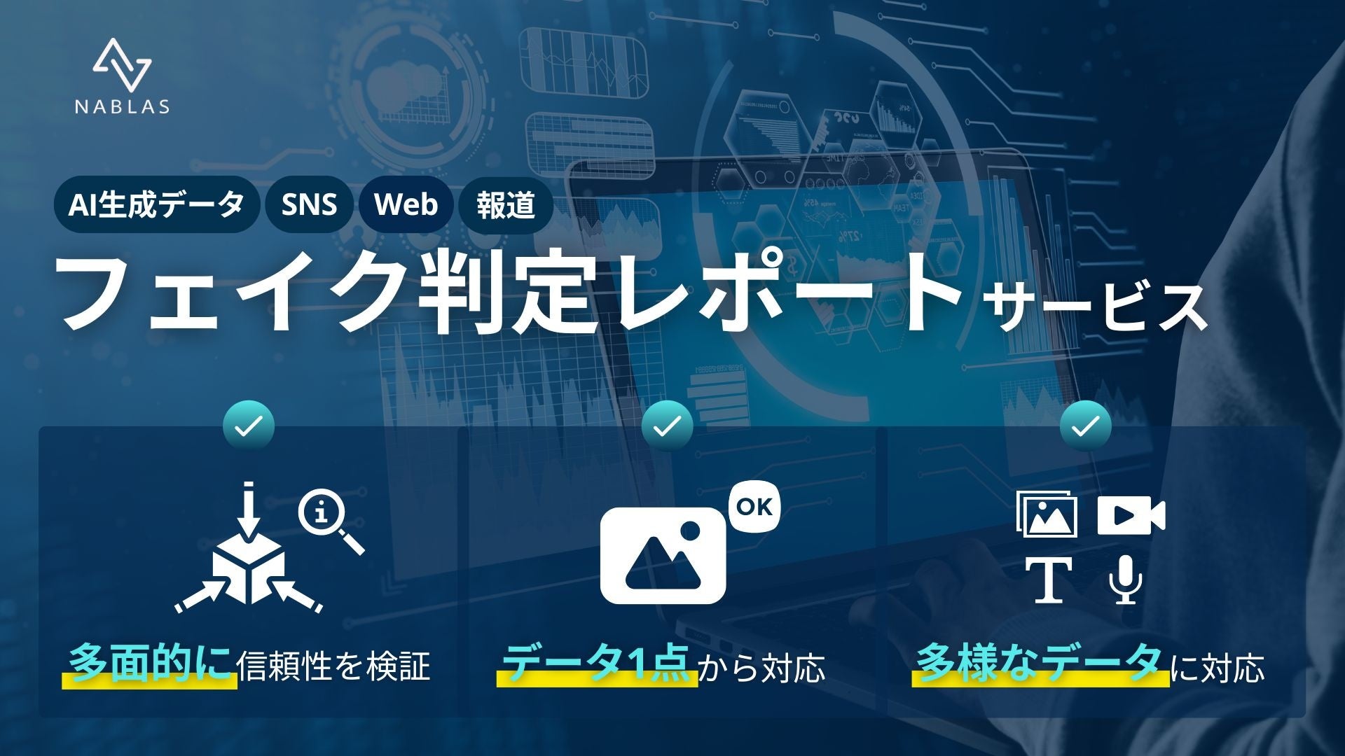 AI総合研究所として活動するNABLAS株式会社 (本社 : 東京都文京区本郷、 代表取締役 所長 : 中山 浩太郎、 以下「当社」)は、フェイク判定レポートサービスの提供を開始しました。本サービスでは、データや情報についてリアルかフェイクかの判定だけではなく、複数の観点からデータが信頼に値するものかを多重的に検証します。これにより、幅広いユーザーやニーズに対する情報の信頼性確保に貢献します。