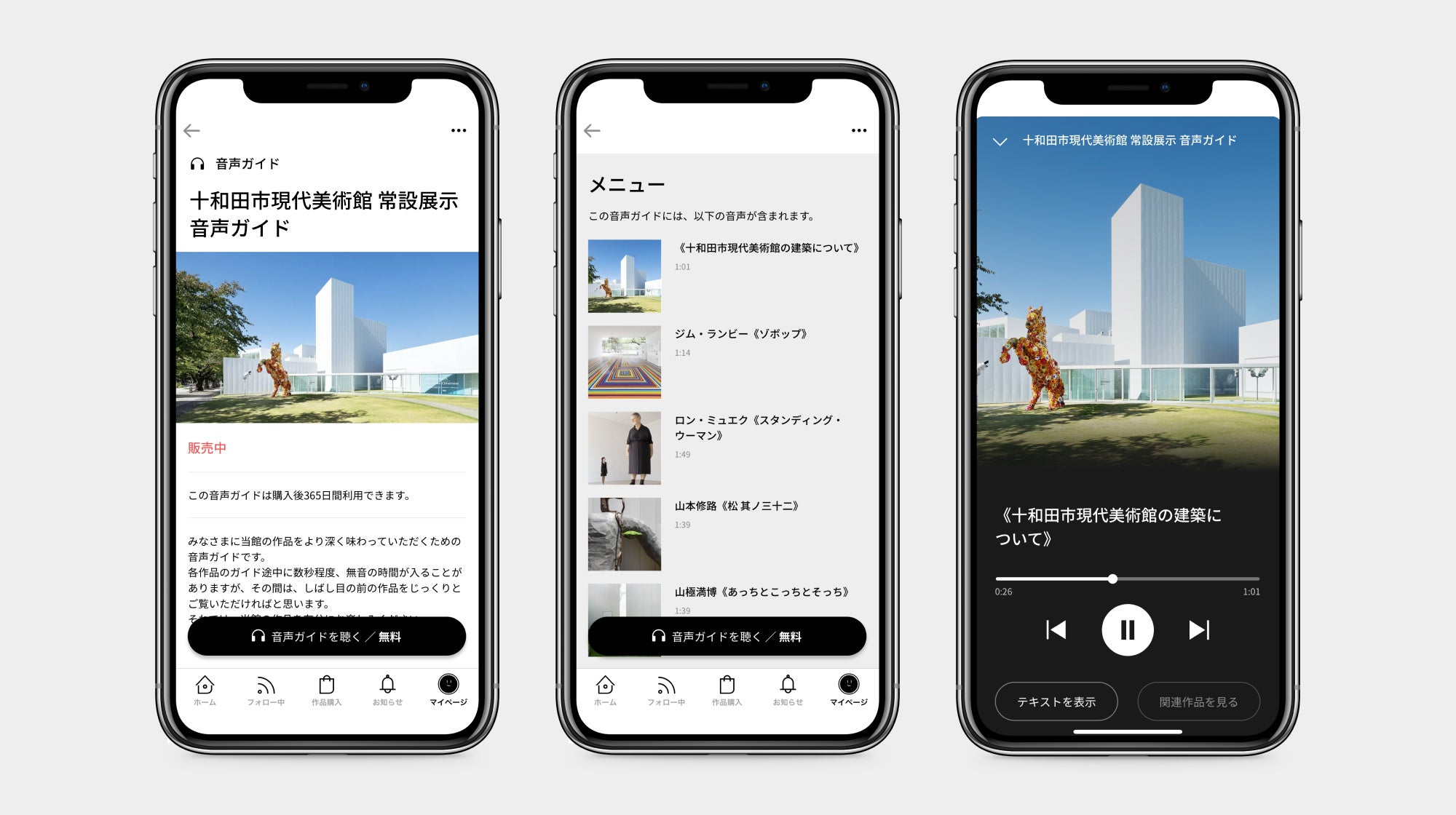 十和田市現代美術館の建築コンセプトや、美術館常設展示の作品について制作背景や作品への想いを音声で聴くことができます。