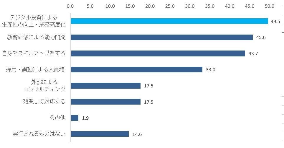 ・『原価低減』のために実行される施策では、1位が「デジタル投資による生産性の向上・業務高度化」でおよそ5割、「採用・異動による人員増」も3割にのぼる