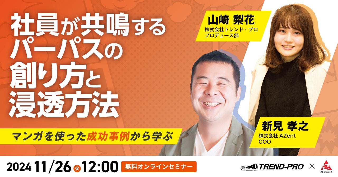 株式会社トレンド・プロ(本社:東京都港区、代表取締役社長:岡崎寛之、以下トレンド・プロ)は、株式会社AZent(本社:東京都港区、代表取締役:柳沼圭佑、以下AZent)と共同で、社員が共鳴するパーパスの創り方と、浸透のためにやるべきことを解説するオンラインセミナーを11/26(火)12時から開催いたします。