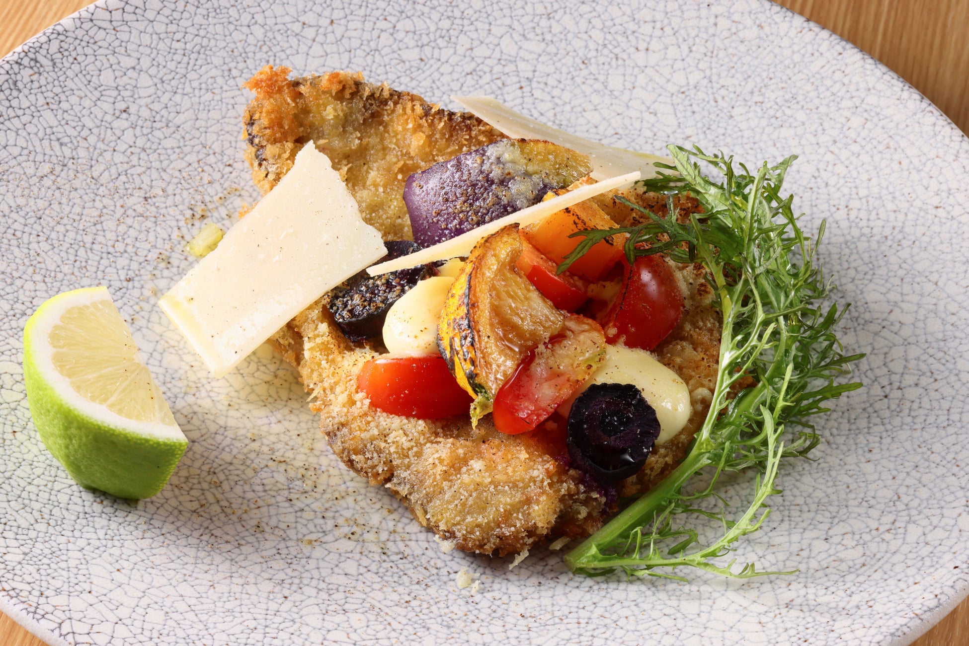 京都産の野菜のおいしさを引き立てるため、ロース肉の脂を省き、ラードにして揚げ油へ。独特の甘みがあり、ねばりがありながら柔らかい、キメ細かい肉質とモチモチした食感が魅力の京もち豚の赤身のみのカツレツをつくりました。その上に季節の京都産野菜をたっぷりのせ、チーズをかけてサラマンダーで焼き色をつけています。