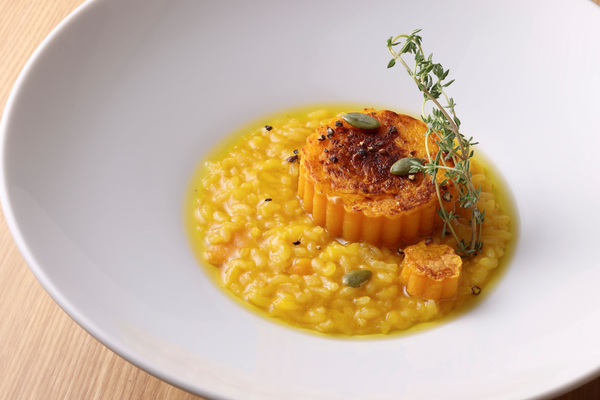 京都産南瓜をブイヨンで煮物を作るようにじっくり煮込み、リゾットを合わせました。南瓜のごろっとした粒感やとろっとした部分など、テクスチャーの違いが魅力です。メープルシュガーでキャラメリゼしたバターナッツ南瓜のローストに、爽やかなヨーグルトをのせて提供いたします。