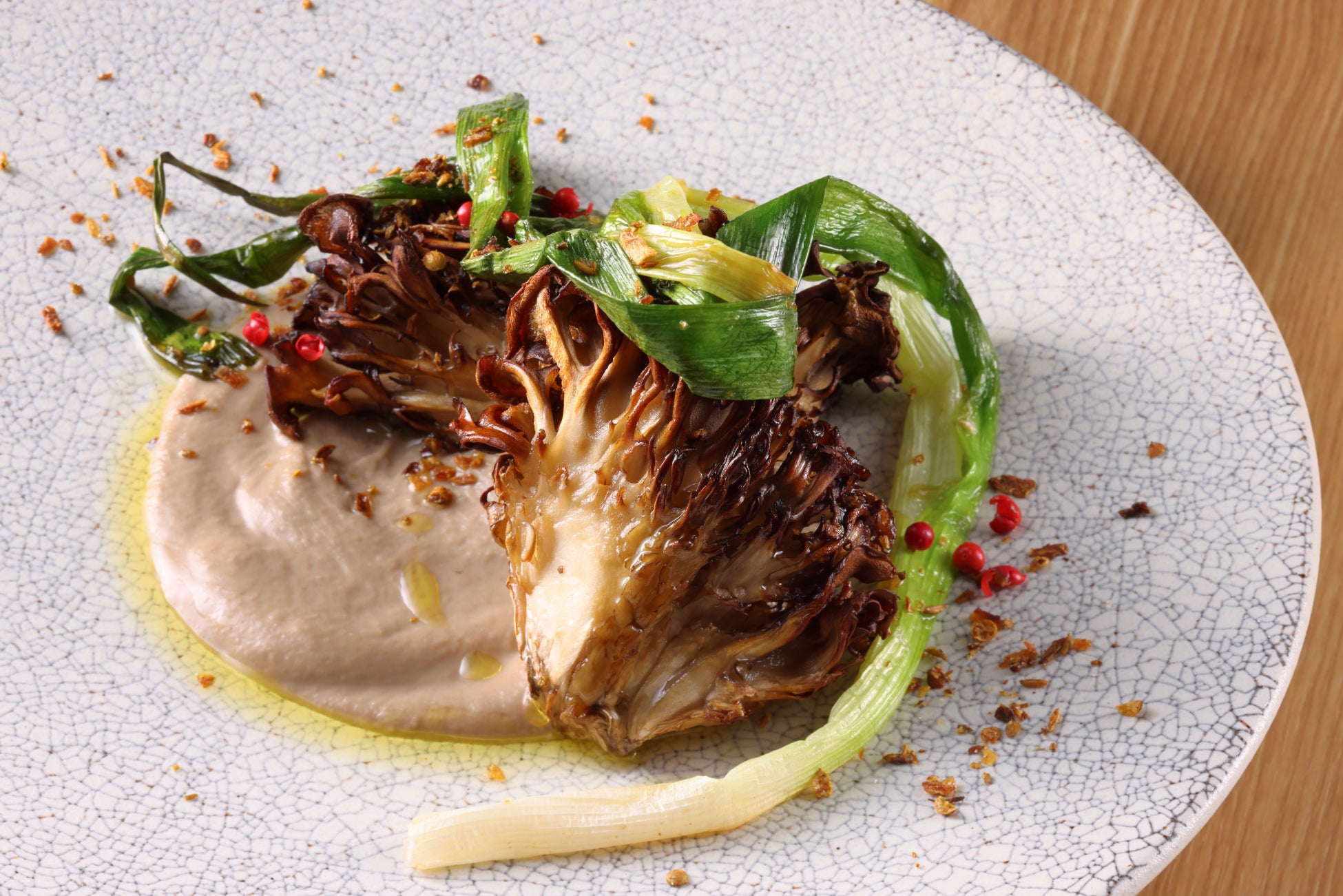 大ぶりな舞茸を丸ごとオーブンに入れ、カリカリにロースト。シェリーで香りづけした焼き栗とマッシュルーム、アーモンドのピュレにより、輪郭のある華やかな秋の香りがお楽しみいただける一品に仕上げました。食べ応えのあるヴィーガンステーキです。