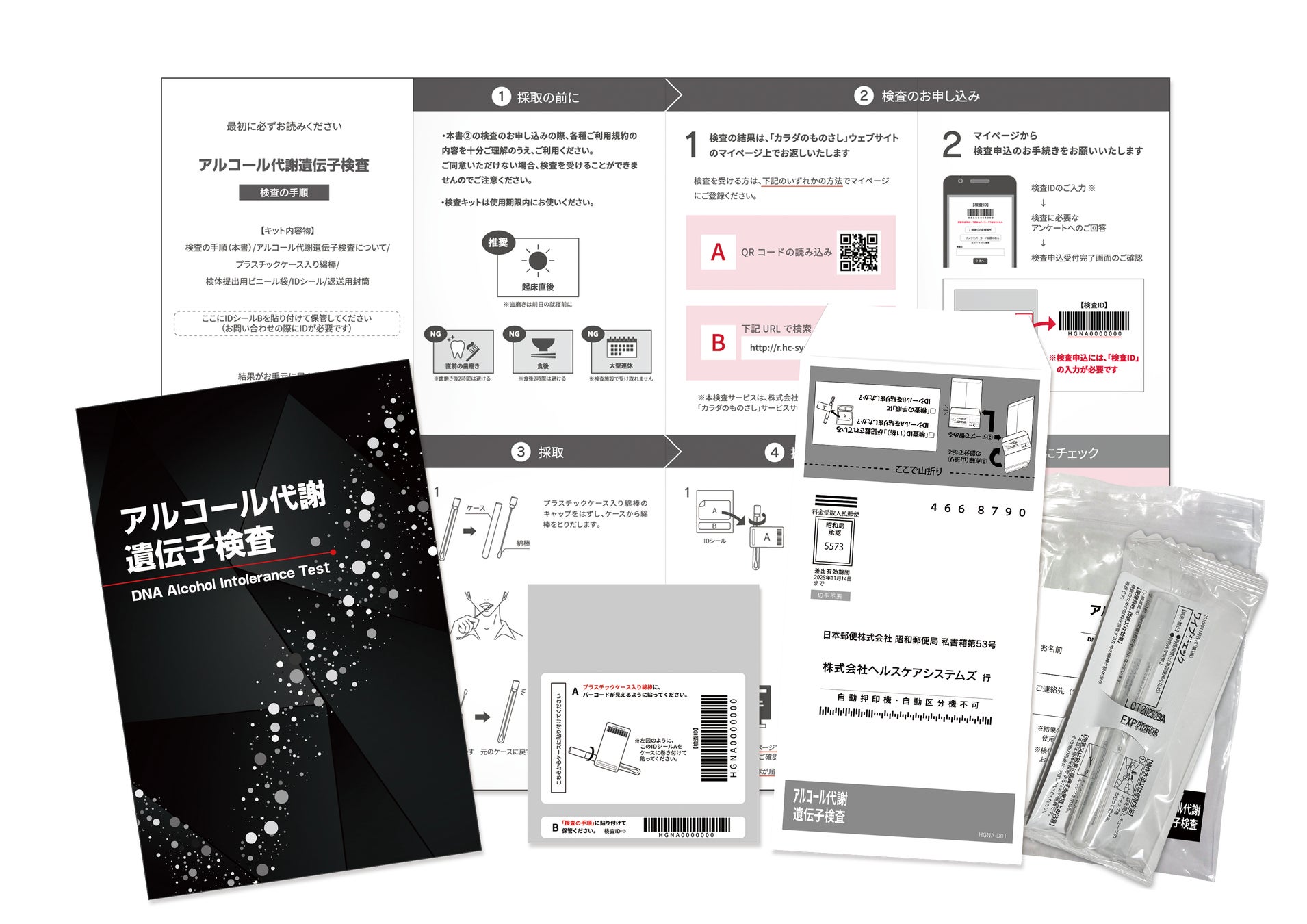 内容物:パンフレット/検査の手順書/スワブ(検体採取容器)/返送用封筒/IDシール/ビニール袋(連絡先確認シール添付)