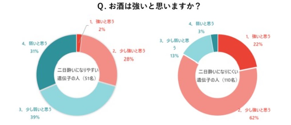 ムサシが2023年10月から11月にかけて行った調査(※1)で、二日酔いになりやすい(アルコールとアセトアルデヒドの分解能力が弱い)遺伝子タイプの人のうち3.5人に1人(30%)は、自分はお酒に強い方だと自覚していることがわかりました。お酒に対するタイプを知ることで、飲みすぎを防ぐことが期待できます。
