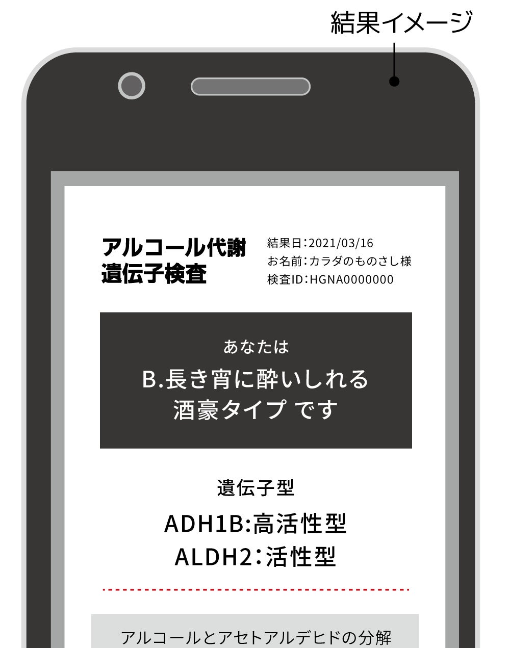 アルコールを分解する2つの酵素の遺伝子から、お酒のタイプがわかり、最適な飲酒習慣を提案する郵送検査サービスです。自宅で、専用の綿棒を使用して口腔内の細胞を採取。ポストに投函すると、約3週間で結果をウェブで受け取れます。アルコールとアセトアルデヒドの分解能力の組み合わせから5タイプ9パターンで判定し、タイプ毎にお酒を飲んだ時の反応や健康への影響等がわかります。生活習慣改善のアドバイスや飲酒コミュニケーションに役立つ情報も受け取れます。