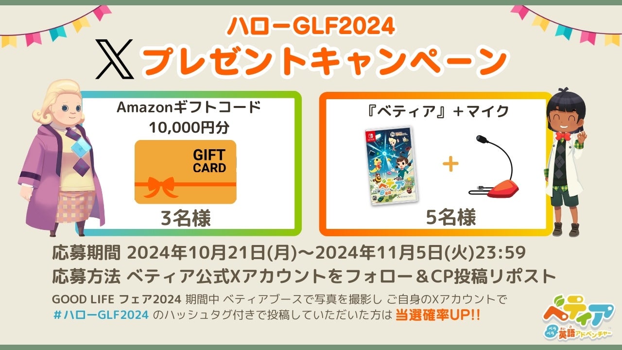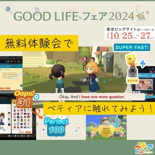 株式会社でらゲー(本社:東京都渋谷区、代表取締役:家次栄一)は、遊びながら英語が自然に学べるNintendo Switch™向け体験型英語学習ゲーム『ベティア ペラペラ英語アドベンチャー』(以下、『べティア』)について、10月25日(金)~10月27日(日)まで東京ビッグサイトにて開催される「GOOD LIFE フェア2024」でブース出展いたします。ブース内では『ベティア』をお試しいただける無料体験会を実施し、来場者にはプレゼントもご用意しております。また今回の出展を記念した、Xでのプレゼントキャンペーンも本日10月21日(月)より開催中です。ぜひこの機会に「GOOD LIFE フェア2024」のベティアブースへご来場いただき、Xキャンペーンへもご参加ください。