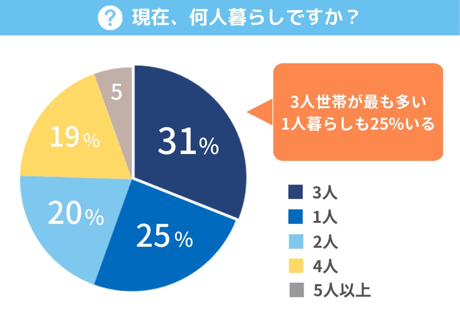 ウォーターサーバーの利用経験者は、3人暮らしの回答数が最も多く、回答割合は31%でした。なおその後は、1人暮らしが25%、2人暮らしが20%と続いています。