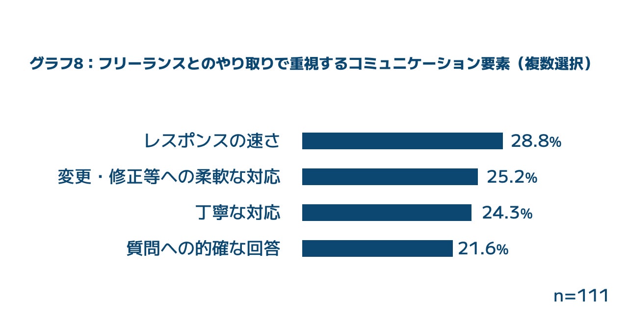 発注者向けの調査で「どのようなフリーランサーに継続して発注したいと思いますか」という質問に対して、最も多かったのは「コミュニケーションのスムーズさ」(29.2%)でした。発注者は納期や価格よりも、コミュニケーション力を重視していることがわかります(グラフ7)。発注者が「フリーランスとのやりとりで重視するコミュニケーション要素」を問う質問で最も回答が多かったのは「レスポンスの速さ」(28.8%)、次いで「変更・修正等への柔軟な対応」(25.2%)、「丁寧な対応」(24.3%)でした(グラフ8)。