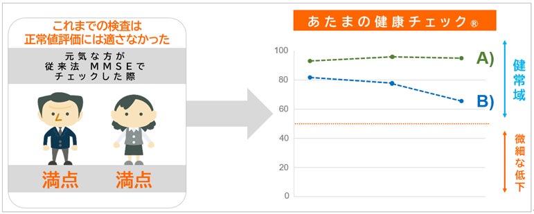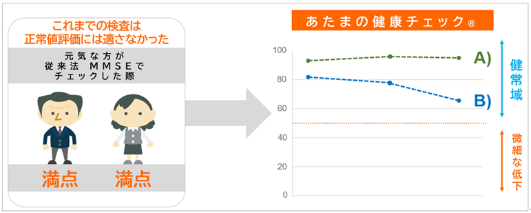 あたまの健康チェック®は、従来検査法では天井効果により安定評価の難しかった「健域」からの正常値の経時変化観察が可能な業界では初めて認知機能スケールです。全国の健診施設や自治体での「あたまの健康チェック®」の社会実装事例から、他の疾病・疾患とは異なり、「あたまの健康」領域では、一般生活者は、自身の認知機能状態を正常値範囲で経時観察することを通じ、「そのままの状態を維持したい」という強い意識の醸成がなされ、認知機能低下予防に資する指導や情報に対して、強い行動変容意欲を示すことが分かってきました。