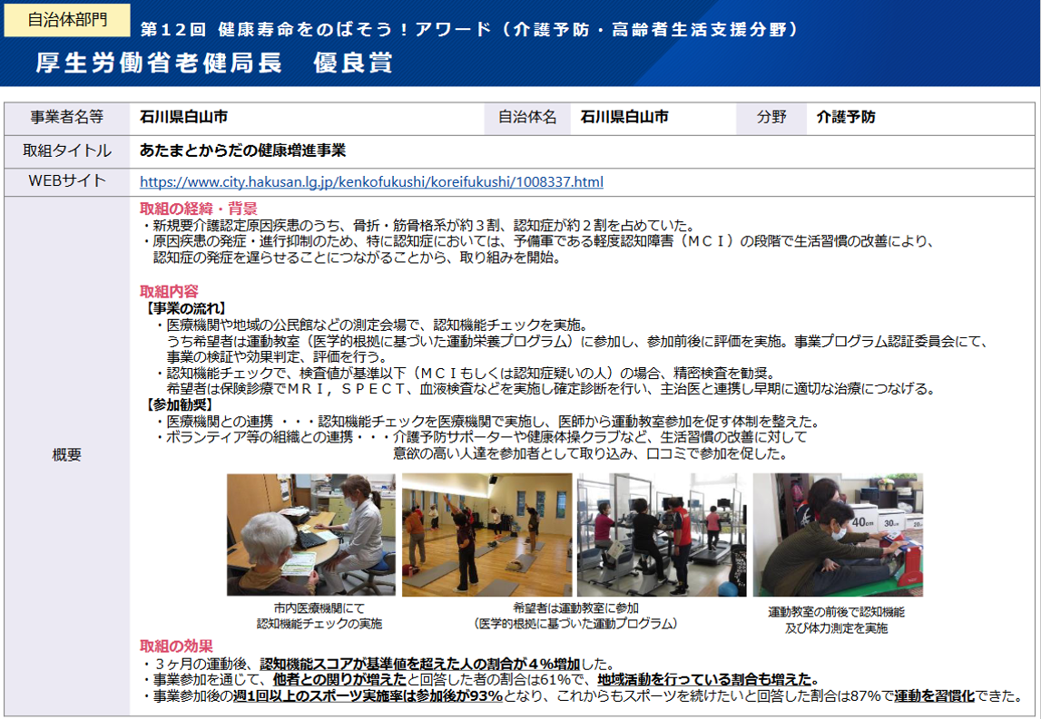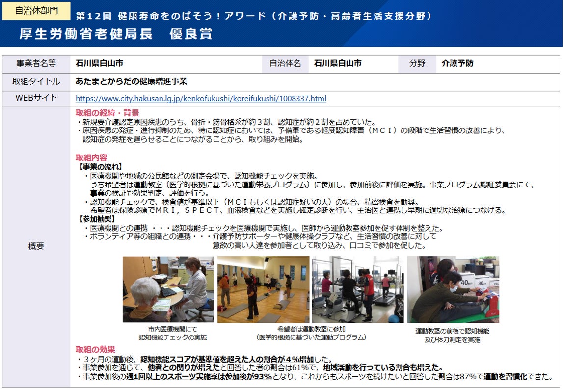 白山市が推進する、元気な頃から運動習慣を通じて認知症予防に取り組む「あたまと体の健康増進事業」が、厚生労働省及びスポーツ庁主催の「第12回 健康寿命をのばそう!アワード(介護予防・高齢者生活支援分野)」にて 『自治体部門:厚生労働省老健局長 優良賞』を受賞いたしました。