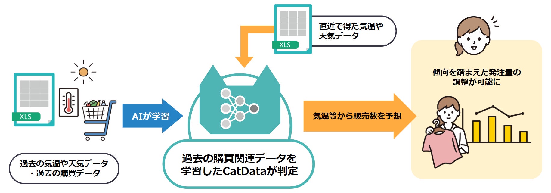 代表的な利用事例として、小売業における販売数予測AIがあげられます。売上データと関連データ(入場者数、男女比、天候など)を利用することで、店舗ごとの特徴を反映した売上予測AIを自社開発できます。