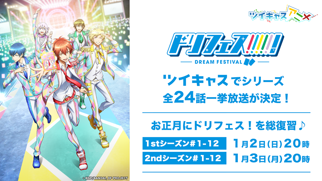 本一挙放送は、2022年1月2日(日)に1stシーズン「ドリフェス!」全12話、1月3日(月)には2ndシーズン「ドリフェス!R」全12話の合わせて24話を一挙放送いたします。この機会にまだ「ドリフェス!」シリーズを見ていない方はぜひご視聴ください。また、翌日の1月4日(火)にはツイキャス内のチケット制ライブ機能「プレミア配信」にて、ドリフェス!スタッフトークショー第二弾が開催されますので、トークショーまでの士気を高めるためにもご活用ください。