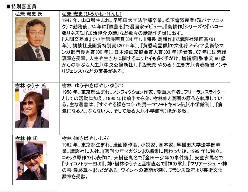 “No Border” をテーマとしたコンテストには、77点の応募作品があり、各賞の審査には、日本のみならず、世界各国で翻訳版が愛読されるワイン漫画「神の雫」原作者、樹林 伸氏ならびに樹林ゆう子氏、社会派漫画を代表する「島耕作」シリーズの作者として知られる、 漫画家・弘兼憲史氏らに特別審査員として審査頂きました。