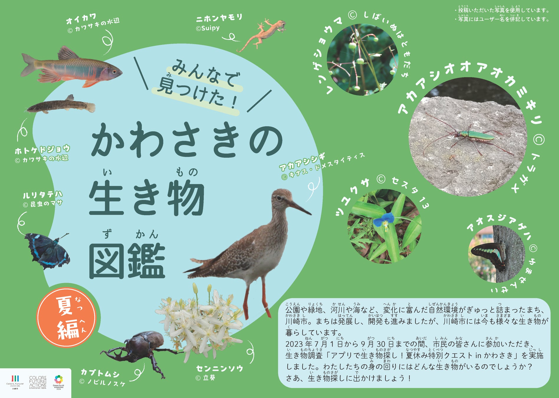 クエスト期間に投稿いただいた生き物の写真は、厳選のうえ川崎市が作成する環境教育・学習用の教材などに使用させていただく予定です。令和5年度は同アプリにおいて「夏休み特別クエストin かわさき」を配信し、投稿されたデータをもとに「みんなで見つけた!かわさきの生き物図鑑 夏編」を作成いたしました