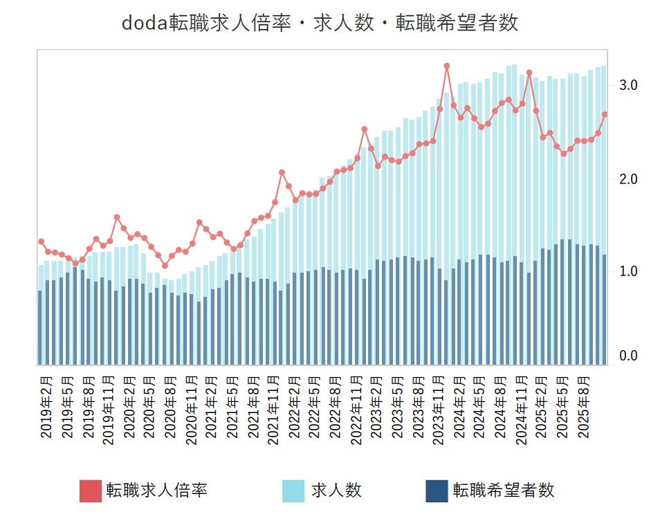 また、ハイクラス・専門職領域における実質的な競争倍率を示す「doda転職求人倍率」は、2025年11月時点で2.70倍という驚異的な数値を記録しています。