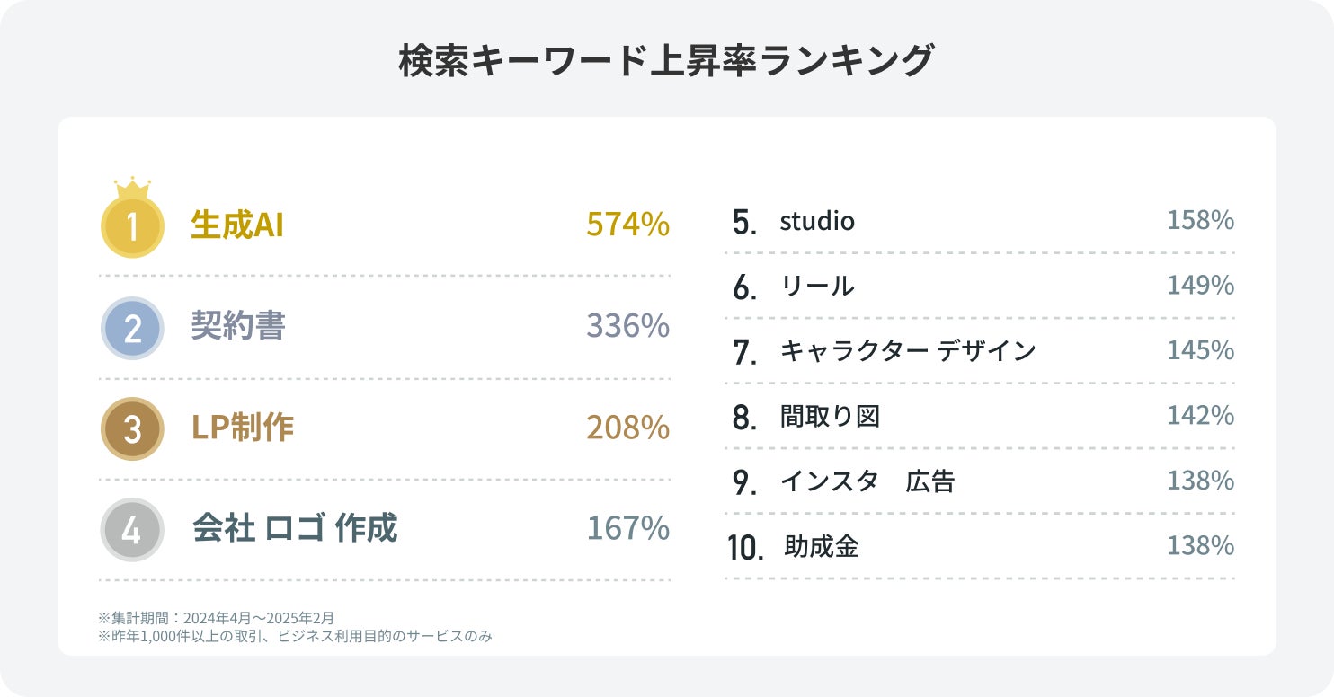 ココナラでユーザーがどのようなワードでサービスを検索しているのかを調査した結果、最も検索回数が多いキーワードは「生成AI」で、前年に比べ574%成長していることが分かりました。利用急上昇ランキングでも高い成長率であったAIカテゴリが多く検索されており、需要の高まりが伺えます。次いで「契約書」がランクインをしており、フリーランス新法の制定やオンライン取引の増加に伴い、法的な知識が求められる契約書作成において行政書士や法務の専門家に相談している人が増えていることが予想されます。