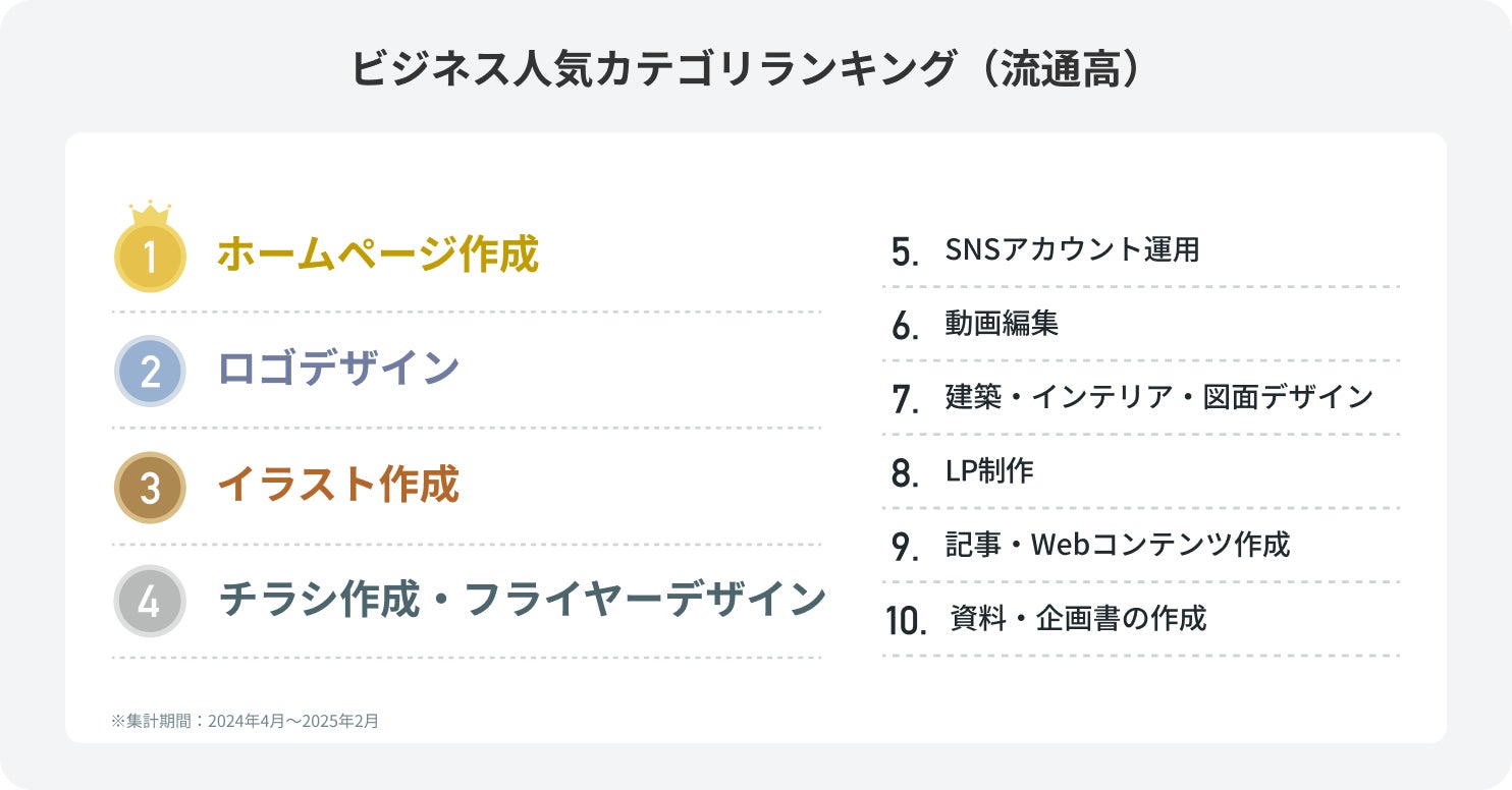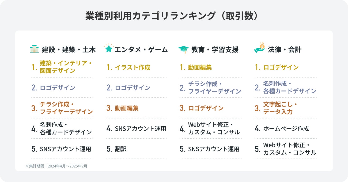 ◼️建築・建設・土木業界では、図面デザインやインテリアデザインの依頼が多く、法律・会計業界ではロゴや名刺制作、アシスタント業務などを幅広く利用。教育業界では、オンライン授業に伴う教材動画編集の依頼が増加し、エンタメ・ゲーム業界では、クリエイティブ制作や翻訳サービスの活用が進んでいる。