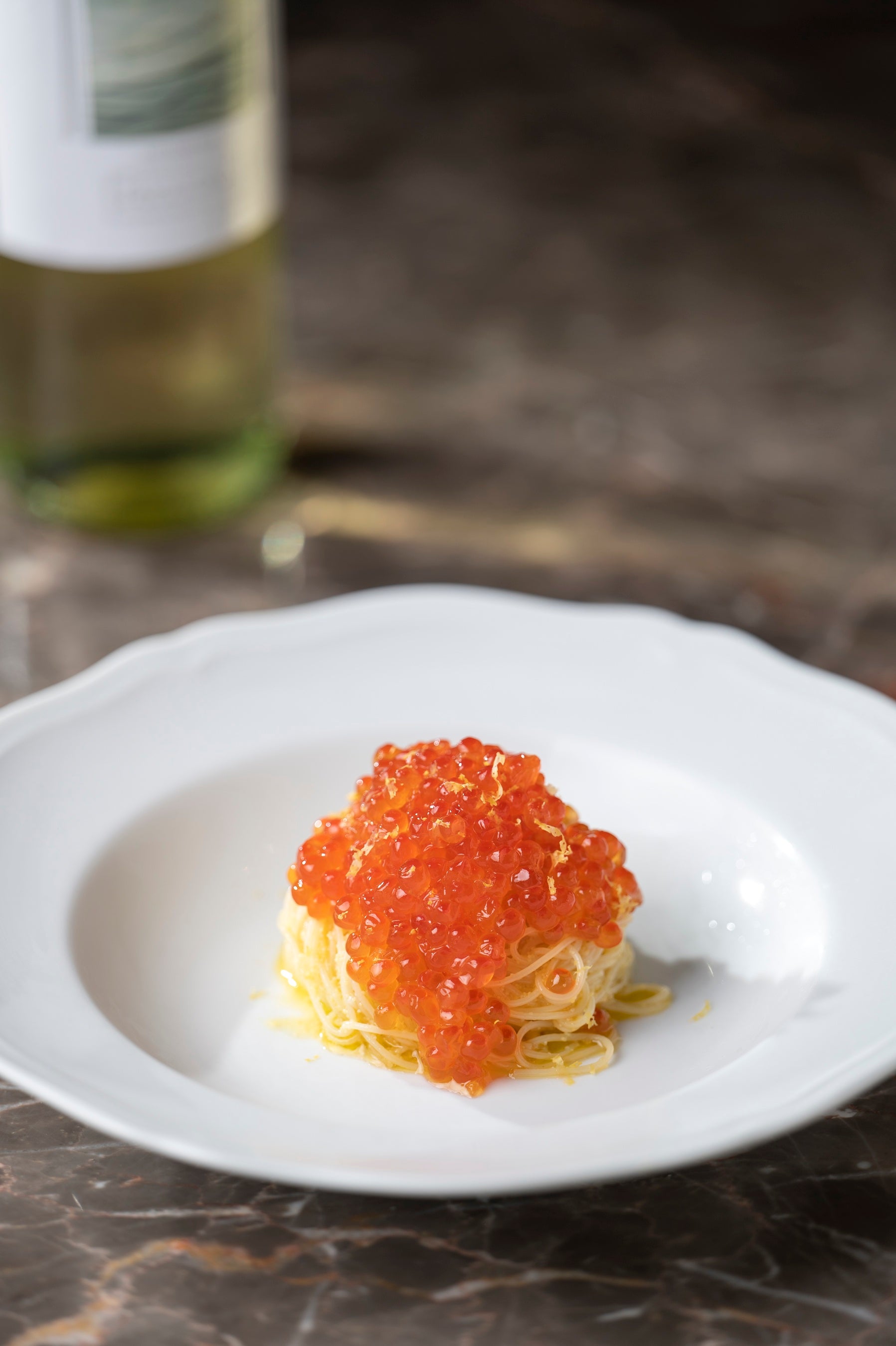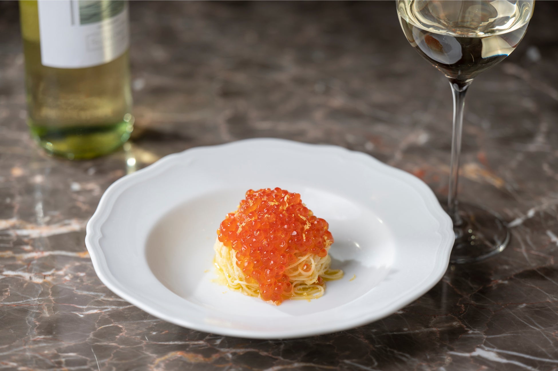 最上階から青山の夜景を一望できる「ROSSI」では、アラスカ産のいくらを惜しみなく使用したパスタ、カッペリーニが登場。オイルベースのシンプルなパスタに、いくらのプチっと弾ける食感とコクがプラスされ、華やかで贅沢な味わいの一皿です。
