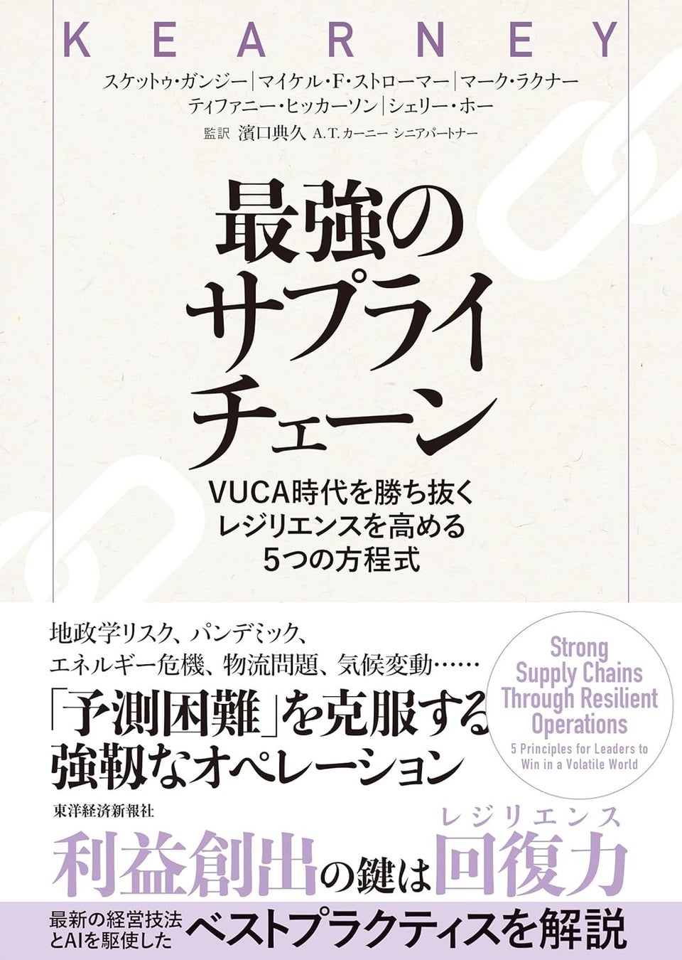 経営コンサルティング会社A.T. カーニー(グローバル・ブランド名はKEARNEY、東京都港区、日本代表:関灘 茂)のシニア パートナー濱口 典久が監訳した書籍『最強のサプライチェーン ~ VUCA時代を勝ち抜く レジリエンスを高める5つの方程式』が、2025年1月15日、東洋経済新報社より発売されます。