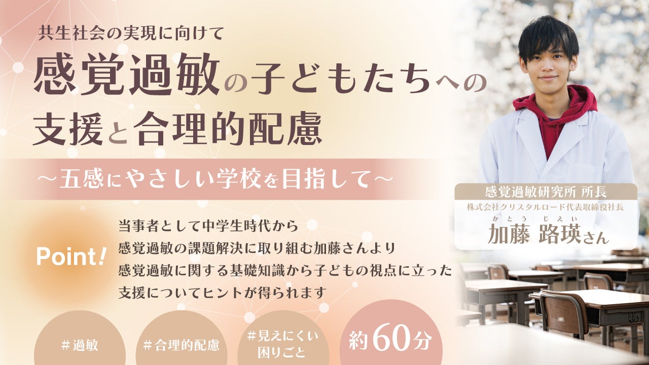 感覚過敏研究所を運営する株式会社クリスタルロード(東京都中央区日本橋、代表取締役社長:加藤 路瑛)は、「感覚過敏の子どもたちへの支援と合理的配慮」をテーマとした講義動画を提供しました。動画は、菅公学生服株式会社(本社:岡山市北区駅元町、代表取締役社長:尾崎 茂)が学校関係者向けに運営するオンラインコンテンツ『Teacher with』にて、2025年4月25日より配信開始されます。全国の学校教職員を対象に、無料でご視聴いただけます。
