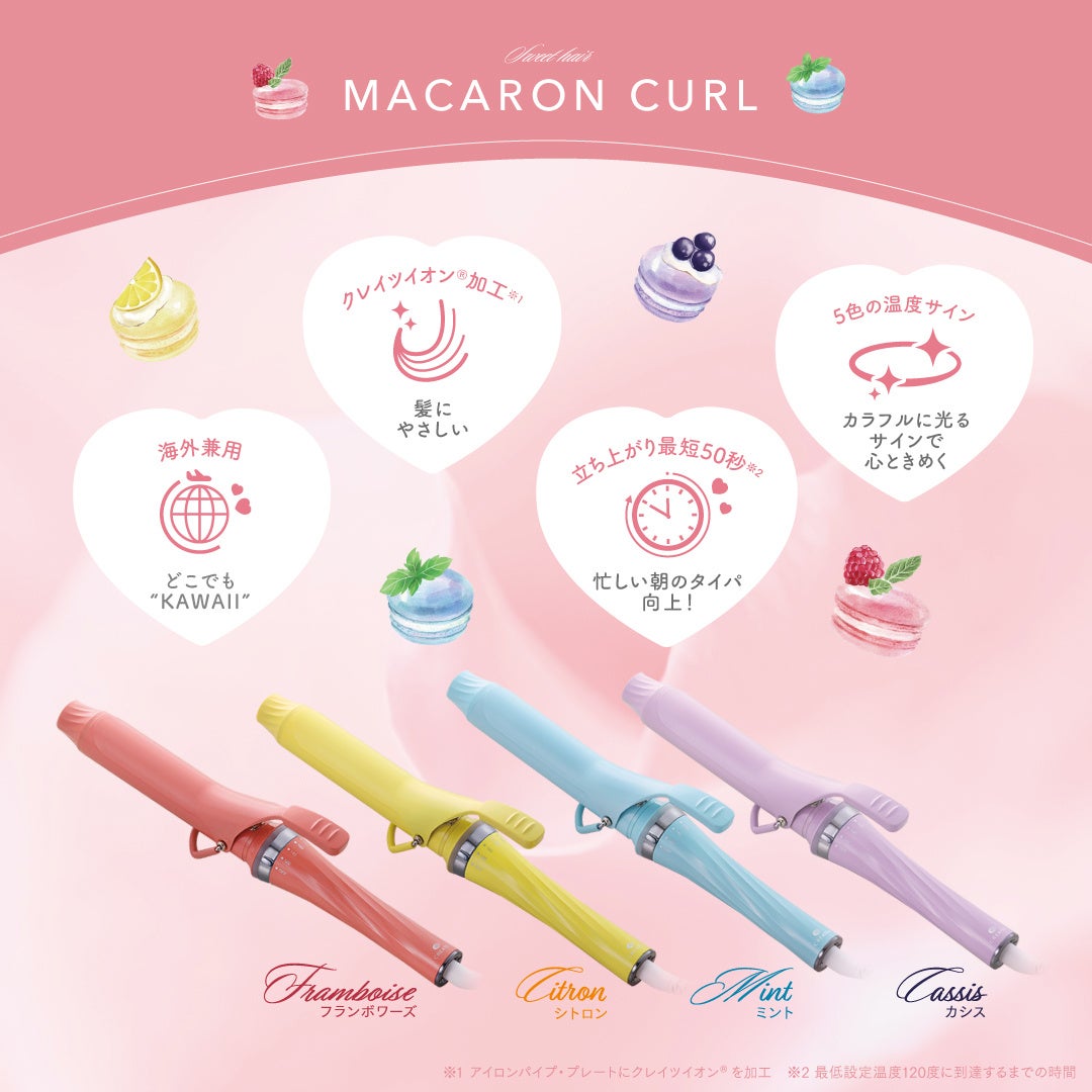 “KAWAIIの魔法”がかかるコテ「マカロンカール」新登場!憧れのアレンジも、質感も“KAWAII”が髪の先まで宿り、アイドルみたいな、うるツヤきゅるんヘアを叶えます。アイロンパイプ、プレートに「クレイツイオン®」を加工。髪の潤いを守りながらキューティクルを整えます。髪質やスタイルに合わせて選べる、5段階の温度調整。ダイヤルをくるくる回すと、LEDインジケーターが温度によってカラフルな5色に変わります。