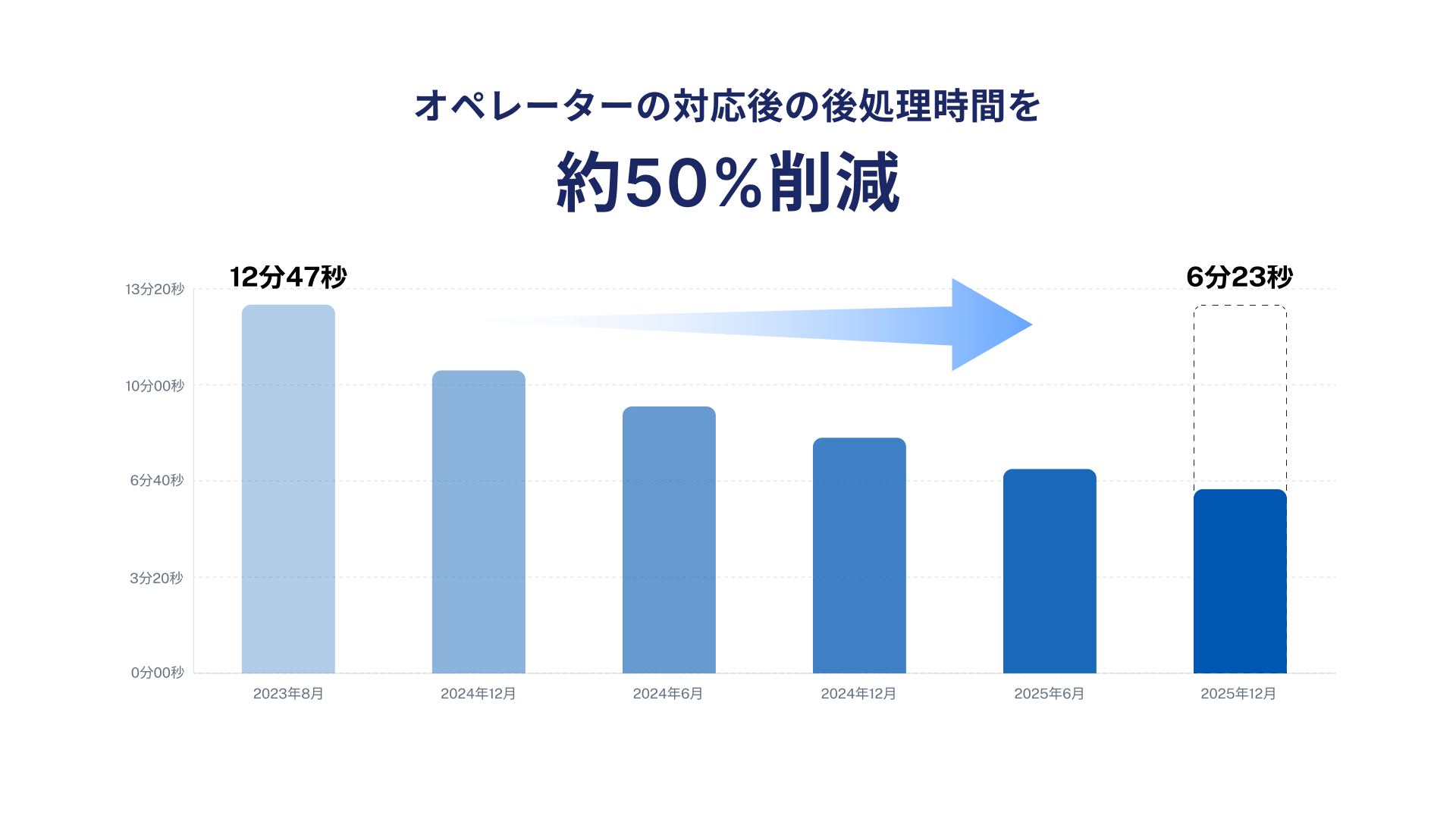 こうした要約難易度の高いお問い合わせに対して、メールおよび電話の要約業務に生成AIを導入した2023年8月には月次の平均後処理時間は12分47秒でしたが、2025年12月には6分23秒と、約50%の時間にまで削減することに成功しました。