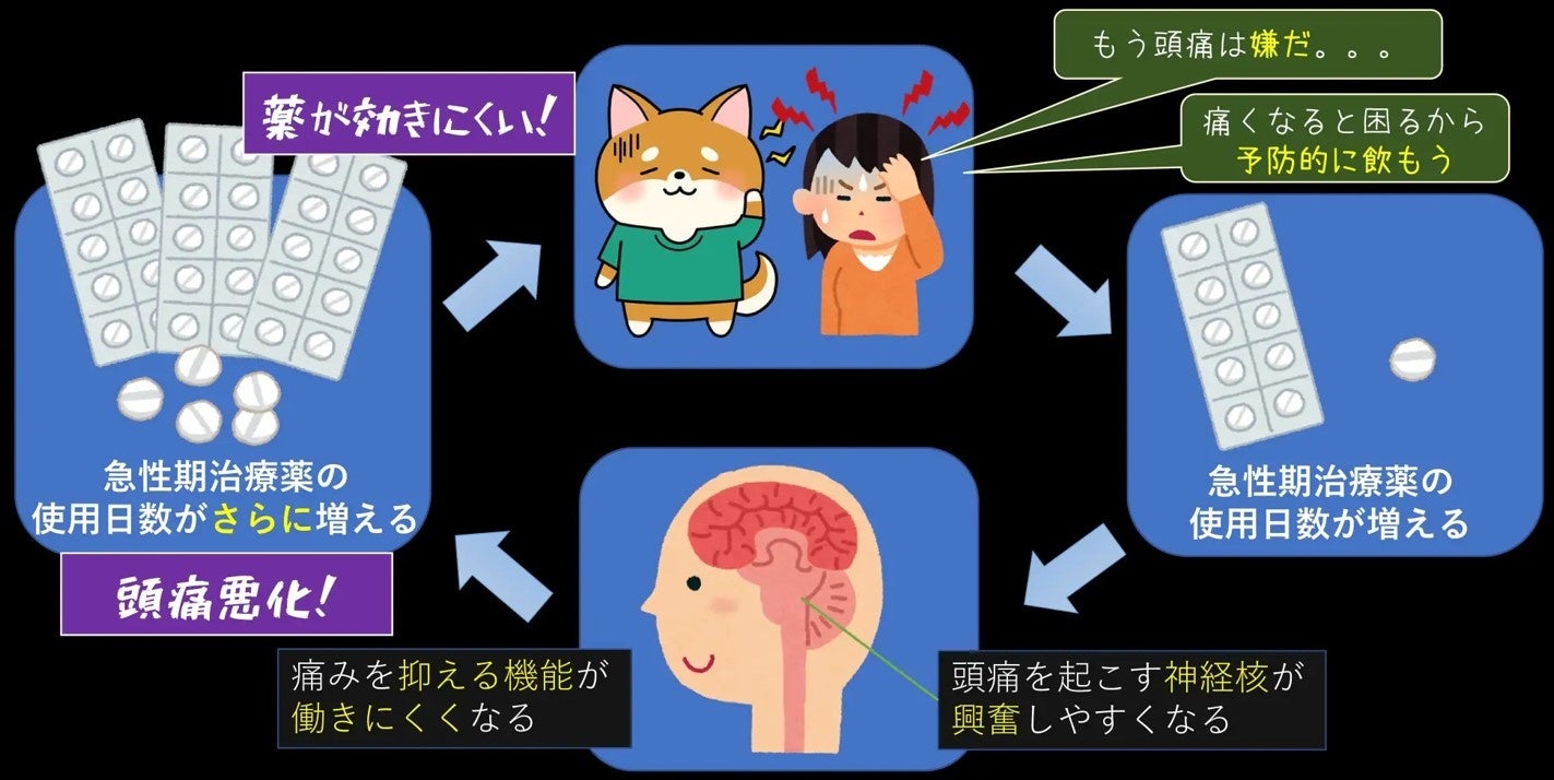 片頭痛を含め頭痛の大半は命に関わることはなく軽視されがちで、片頭痛患者の約7割は医療機関を受診せず、市販の痛み止めを使ったり我慢をしたりしているのが実情です。そのため「頭痛になったら困るから痛くないけれど予め飲んでおこう」というように頻繁に痛み止めを使用する人が多く、その結果、頭痛を起こす神経核が興奮しやすくなったり痛みを抑える機能が働きにくくなり、頭痛が悪化してしまうのです。