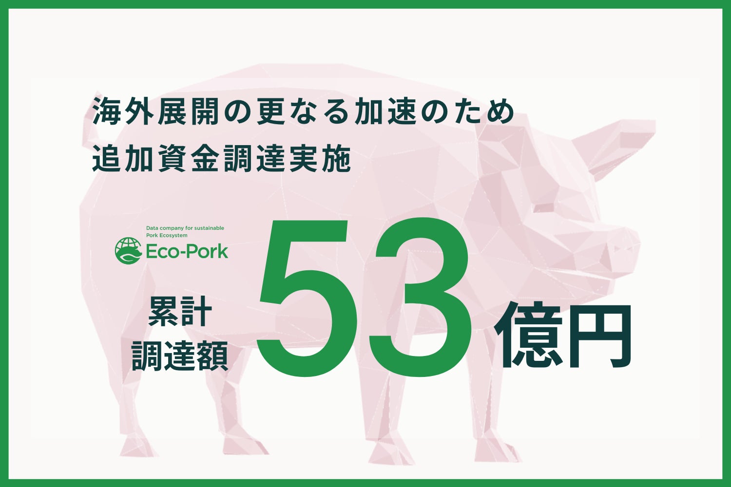 養豚における生産性と環境配慮の両立を支援するスタートアップ、株式会社Eco-Pork(本社:東京都、代表取締役:神林 隆、以下「当社」)は、エクイティ及びデットによる追加資金調達を完了し、累計調達額が53億円(補助金、融資を含む)を突破したことをお知らせします。今回の調達を通じて、日本発の養豚DXとカーボンクレジットを軸に、アメリカやウクライナをはじめ世界各国へ事業を拡大します。持続可能な畜産の実現を通じて、深刻化するタンパク質危機と食料問題の解決に挑みます。