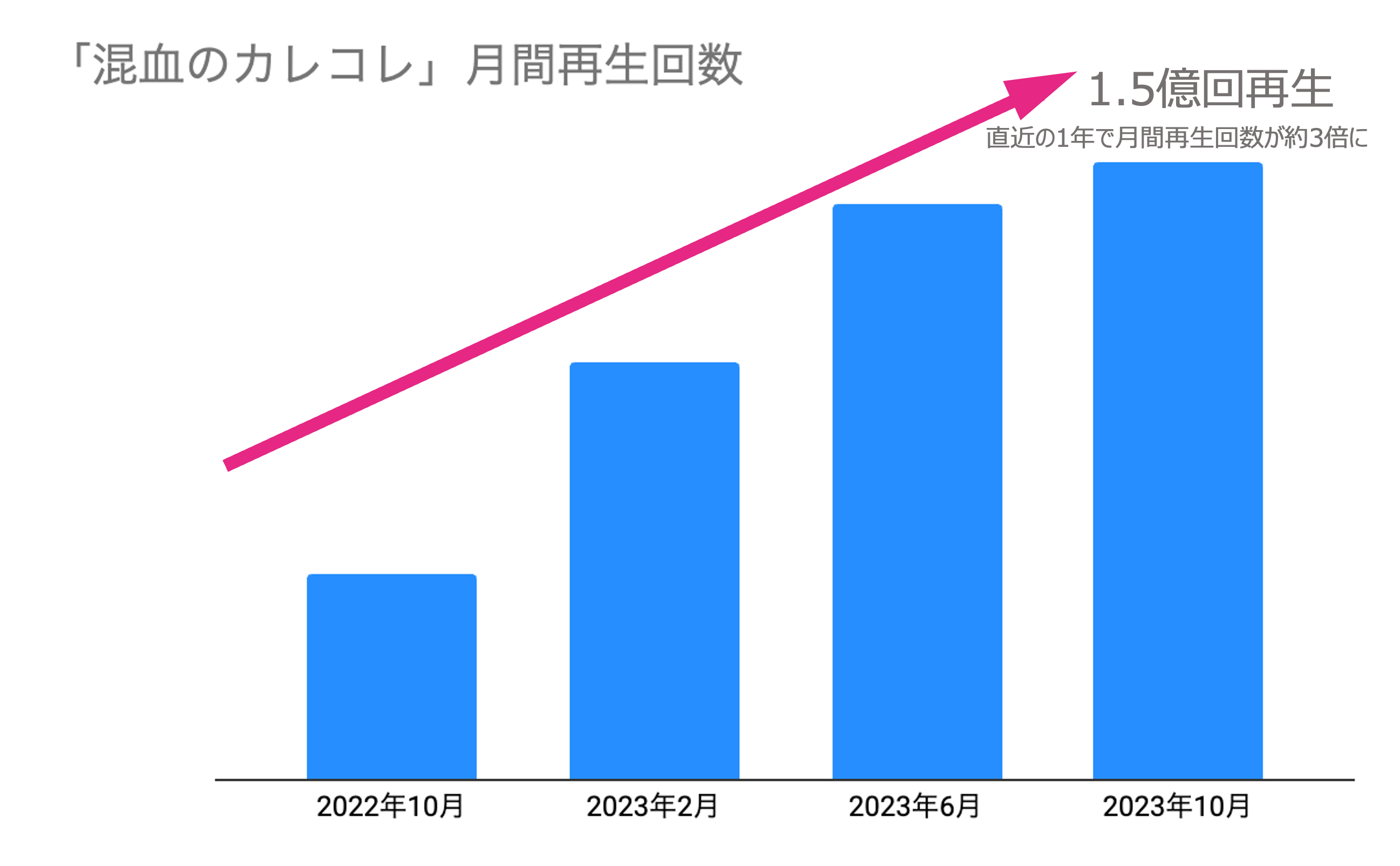 SNSアニメ『混血のカレコレ』は月間動画再生回数ランキング【ノンバーバル除く】にTOP10入りするなど※小中学生のユーザーをメインに動画再生回数を伸ばしています。また、直近の1年では月間再生回数が約3倍になり、2019年のチャンネルスタートから順調に成長しています。