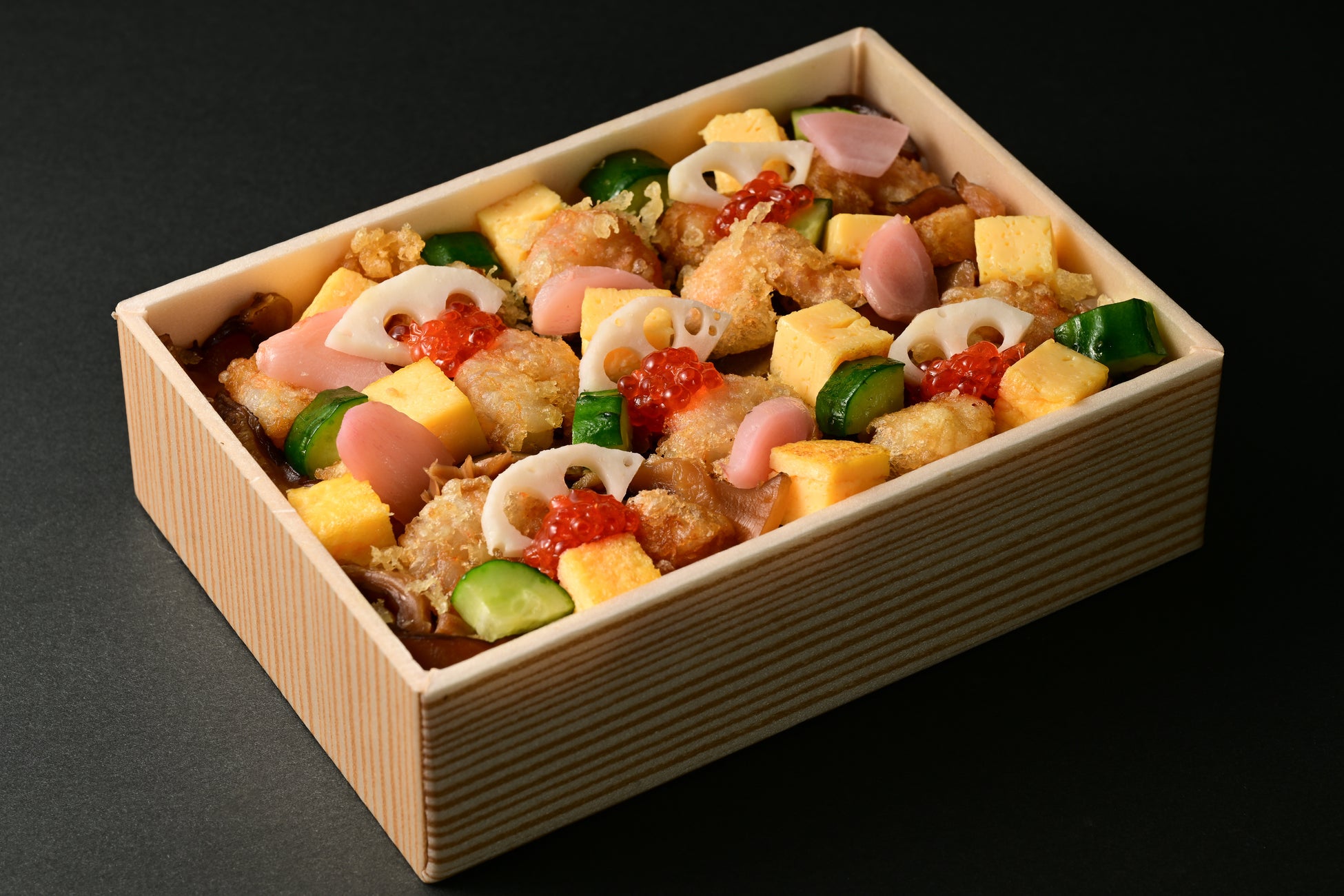 さっくりと揚げた海老と小柱の天ぷらに「金子半之助」の秘伝の丼たれを絡め、いくらや、甘辛く煮た椎茸、厚焼き玉子、甘酢生姜、れんこん、きゅうりと一緒にふっくらと炊き上げたごはんの上に散りばめました。