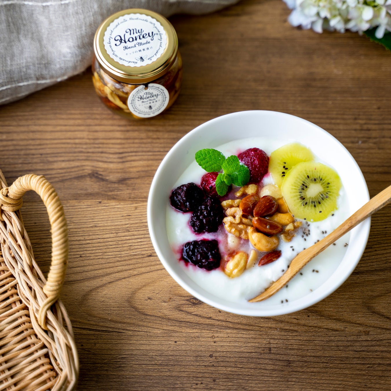 さらっとしたクセのない生はちみつが香ばしいナッツと美味しくマリアージュ。