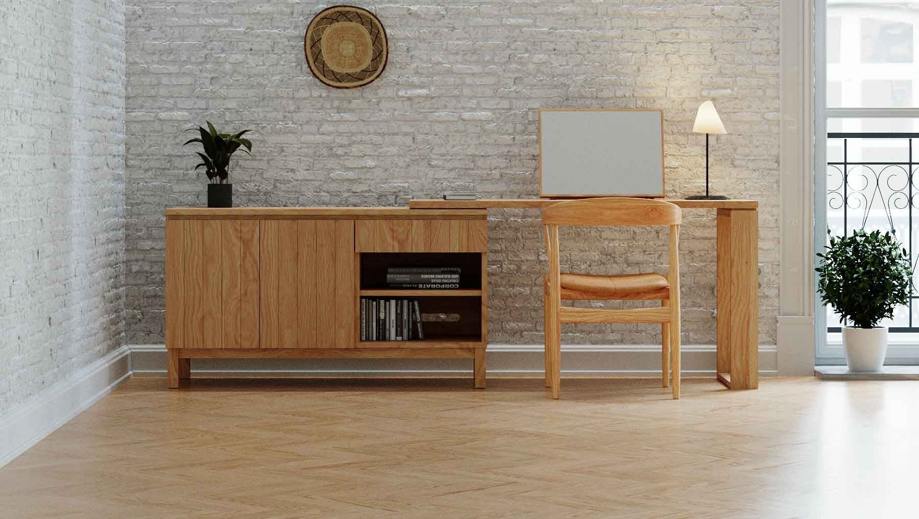 キャビネットのオープンスペースは可動棚が取り付いており、様々な高さの家庭用プリンターが収納できるよう設計しています。