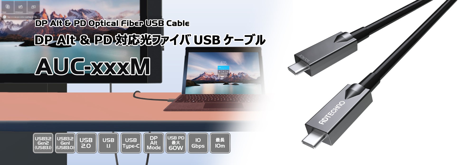 株式会社エーディテクノ(東京都新宿区)はDP Alt & PD対応 光ファイバUSBケーブル 7m[型番:AUC-007M]、10m[型番:AUC-010M]を2022年10月20日(木)より発売いたします。