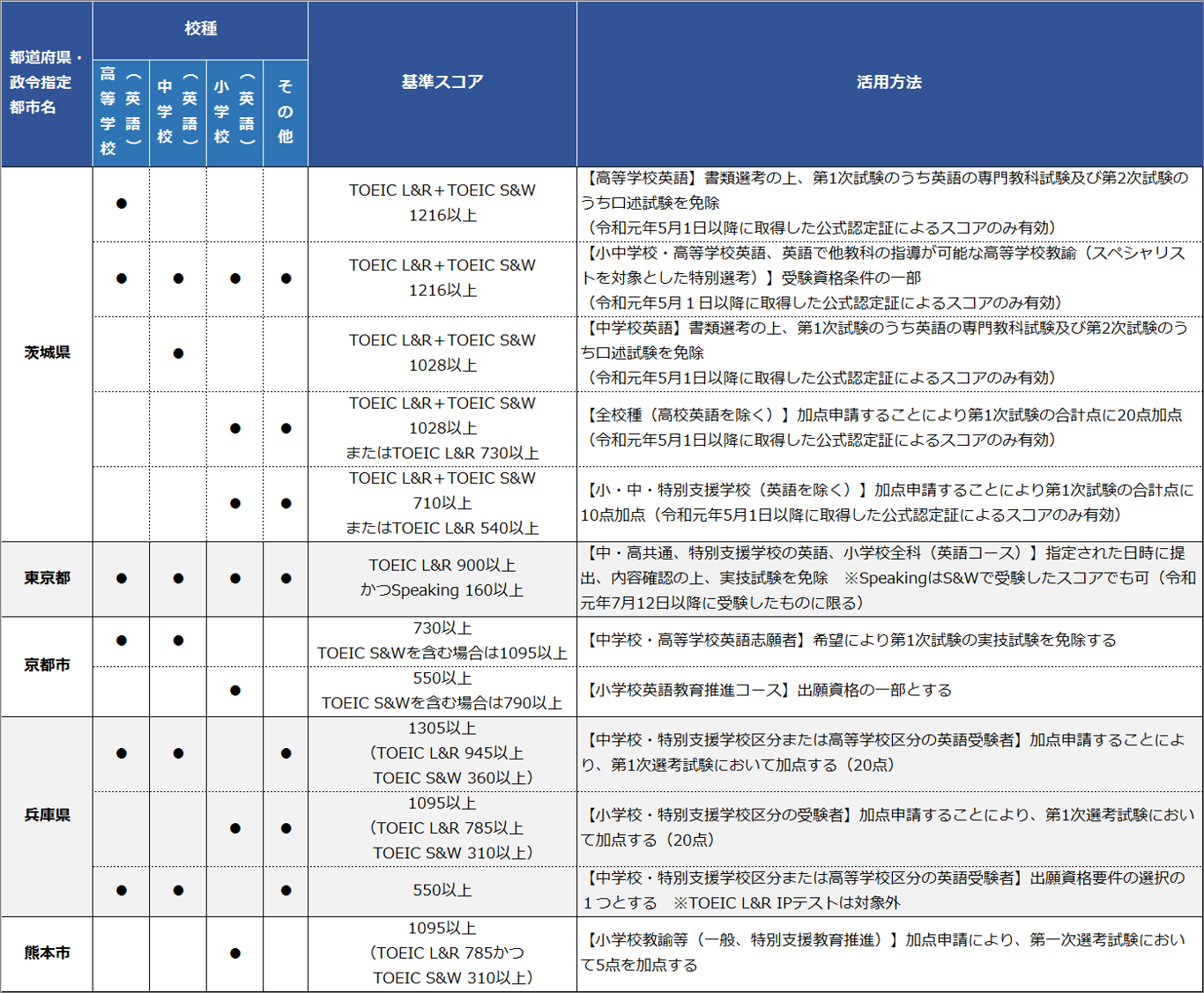 日本でTOEIC(R) Programを実施・運営する国際ビジネスコミュニケーション協会(IIBC)(所在地:東京都千代田区永田町、理事長:大橋圭造)は、2021年10月に実施した独自調査に基づき、全国都道府県・政令指定都市での2022年度教員採用試験におけるTOEIC(R) Testsのスコア取得者に対する優遇措置をまとめましたので、発表いたします。