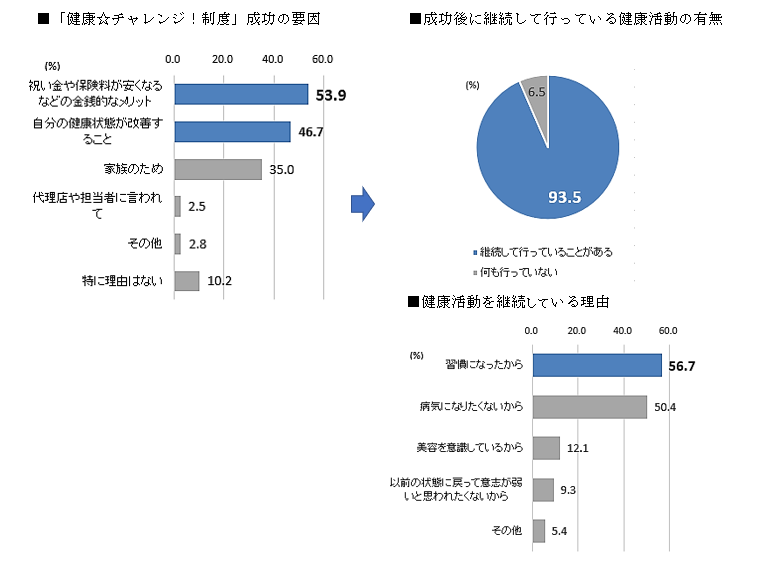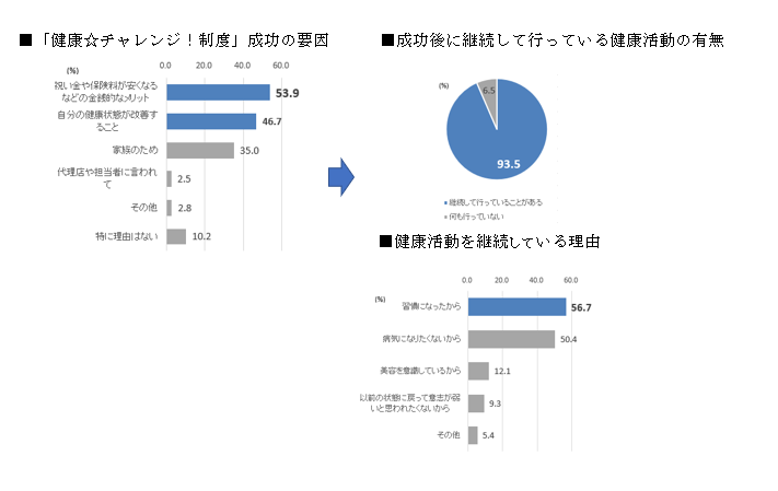 「健康☆チャレンジ!制度」成功者にアンケート調査を実施したところ、成功の第一の要因は金銭的メリットではあるものの、成功した後も健康活動を継続している人が93.5%で、その理由としては「(健康活動が)習慣になったから」との回答が得られました。