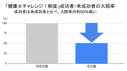「健康☆チャレンジ!制度」成功者の入院率を調査したところ、成功者の入院率は「健康☆チャレンジ!制度」未成功者の入院率と比較して、約50%低いとの結果が出ました。