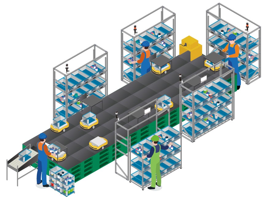 DASを始めとした従来型の仕分けシステムでは1系統ごとに商品をトータルピッキングする必要あり、ピッキングの回数が多く生産性向上に限度がありました。一方でt-Sortは精密機器や化粧品などのワレモノや、食品など綺麗に出荷箱に敷き詰める商品の場合には不向きでした。これらの課題を解決するのがt-Sort MASです。複数系統分の仕分けシステムの商品をまとめてトータルピックすることで生産性が大きく向上、さらにt-Sortで該当の仕分けシステム前まで商品を無人運搬し、最後は人の手で仕分けシステムの各間口に丁寧に仕分けが可能です。また、仕分けシステム前に配置する人数を変化させることで処理能力の調整も可能で、繁閑の差が激しい仕分け現場にもおすすめです。